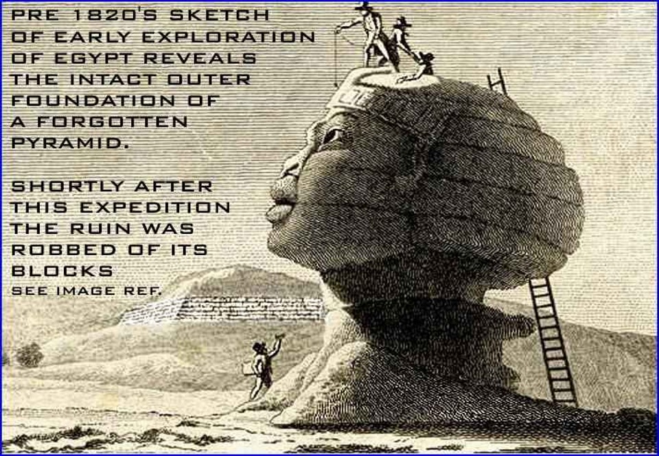 Az 1820 –ban egy  felfedező  expediciót ábrázoló rézkarcon  a  szfinx hátterében  ott a lerombolt piramis és a  piramis burkoló kövei  ekkor még  megvoltak. A művész: Denon Vivant 1747 - 1825